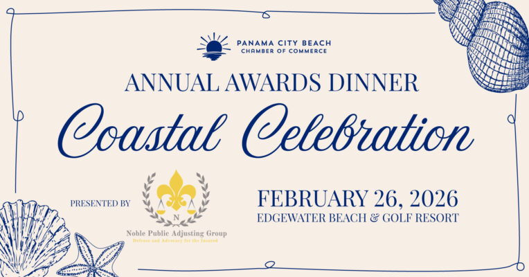 The Panama City Beach Chamber of Commerce is gearing up to host the most anticipated event of Bay County’s local award season! The 2026 Annual Awards Dinner, presented by Noble Public Adjusting Group, will take place at Edgewater Beach and Golf Resort from 5:30 PM until 9:00 PM. Cocktail Hour starts at 5:30 PM and the awards program promptly begins at 6:30 PM.